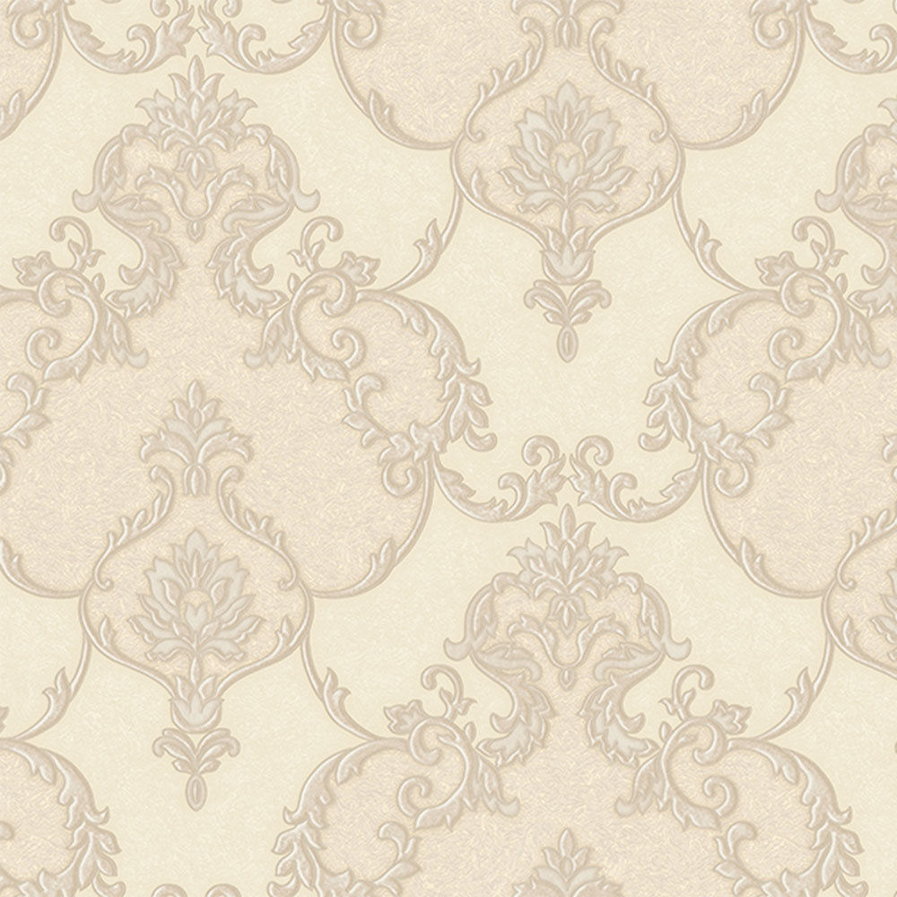 Luxuriöse beige Vliestapete, Barockmuster mit Halbglanz, kleinem Glitzer.