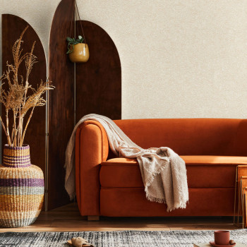 Luxuriöse hellbeige Vliestapete, barockes Stuckmuster mit kleinem Glitzer und zartem Halbglanz.