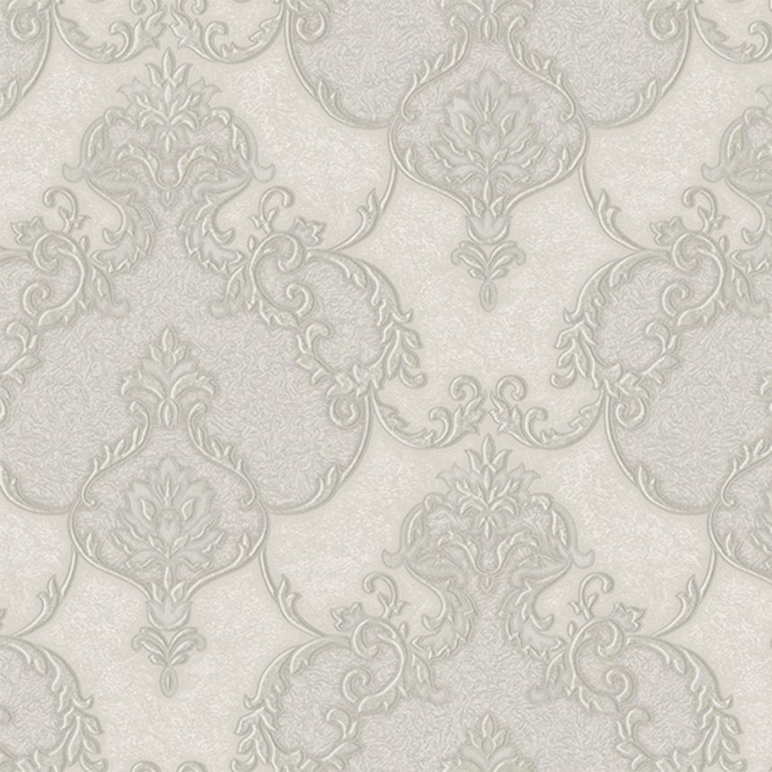 Luxuriöse graue Vliestapete, barockes Stuckmuster mit kleinem Glitzer und zartem Halbglanz.