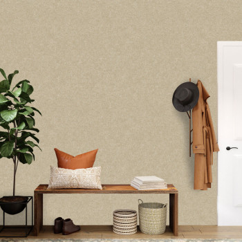 Luxuriöse beige-goldene Vliestapete, barockes Stuckmuster mit kleinem Goldglitzer und zartem Halbglanz.