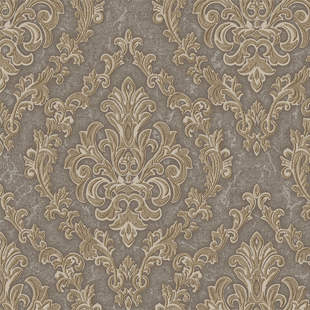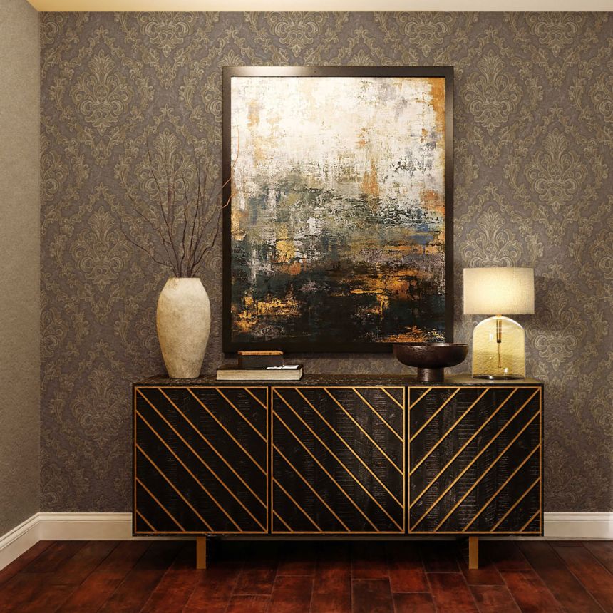 Luxuriöse braune Vliestapete mit Vinyloberfläche, halbglänzendes braun-beiges Barockmuster mit winzigem Goldglitzer.