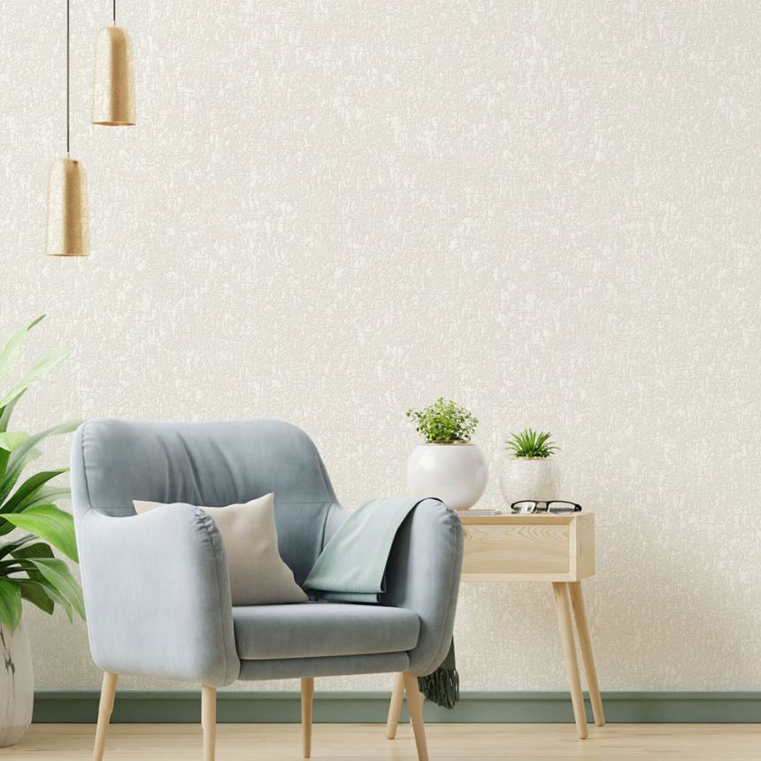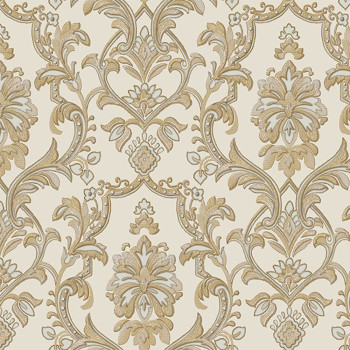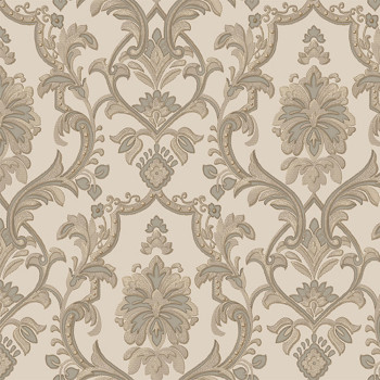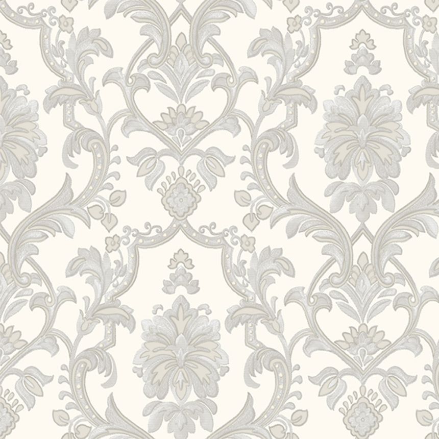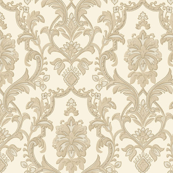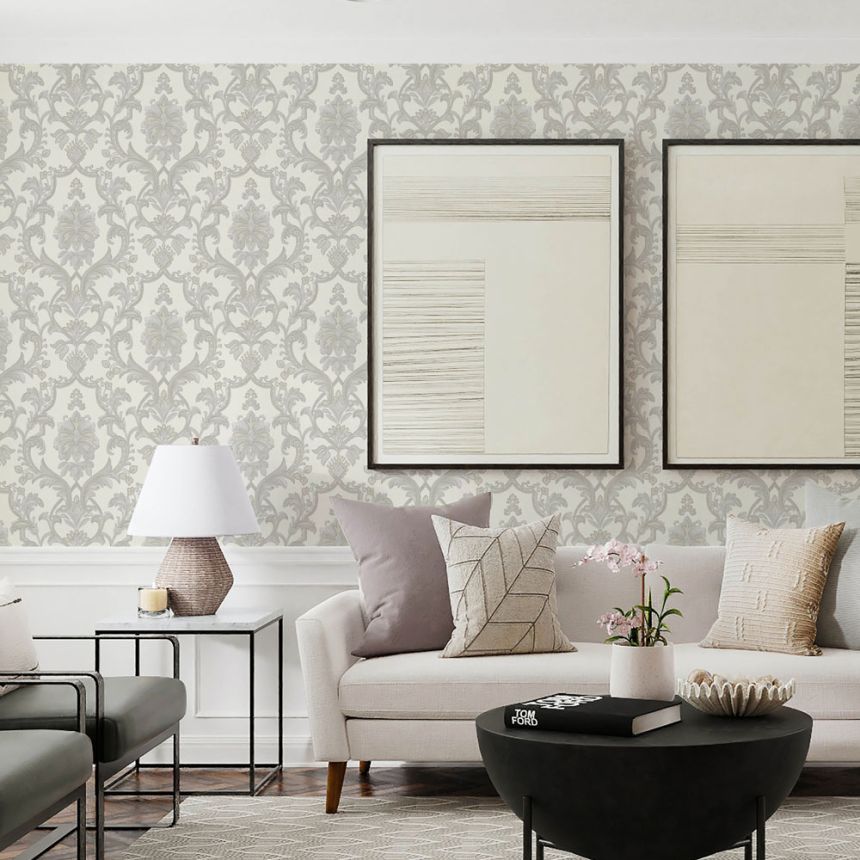 Luxuriöse cremefarbene Vliestapete, graubeiges Barockmuster mit Silberglitzer.