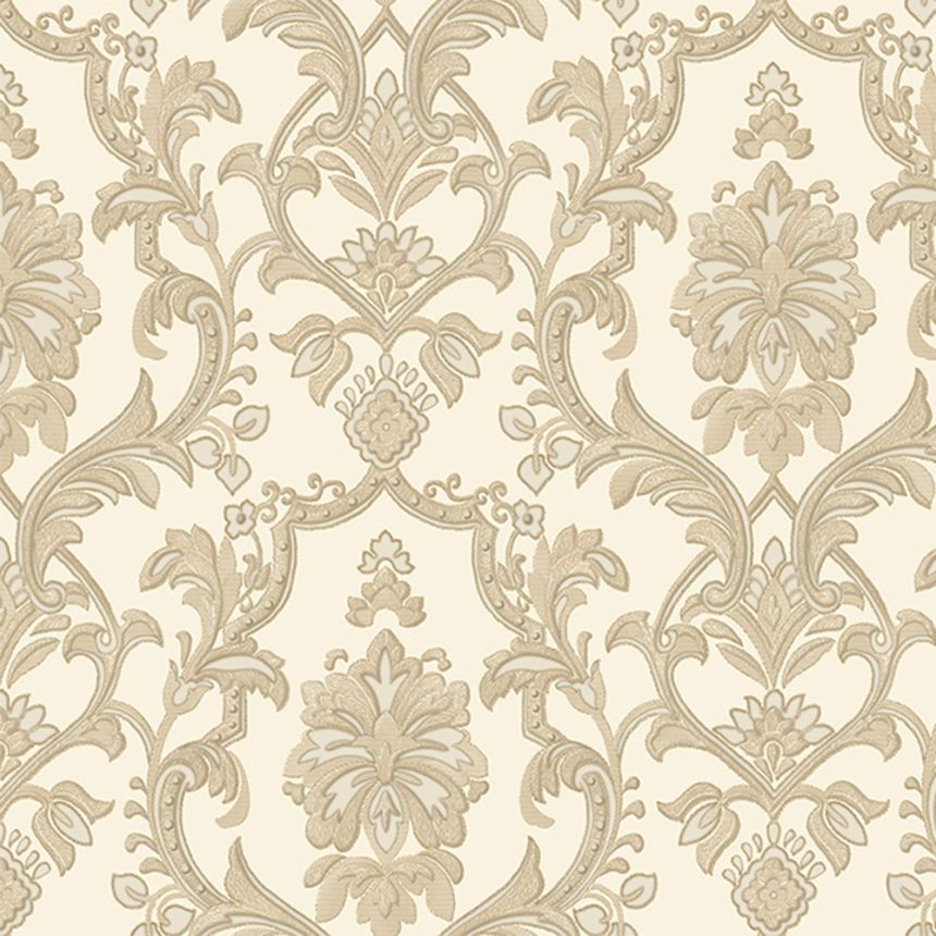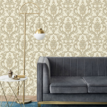 Luxuriöse beige Vliestapete, braun-beiges Barockmuster mit Goldglitzer.