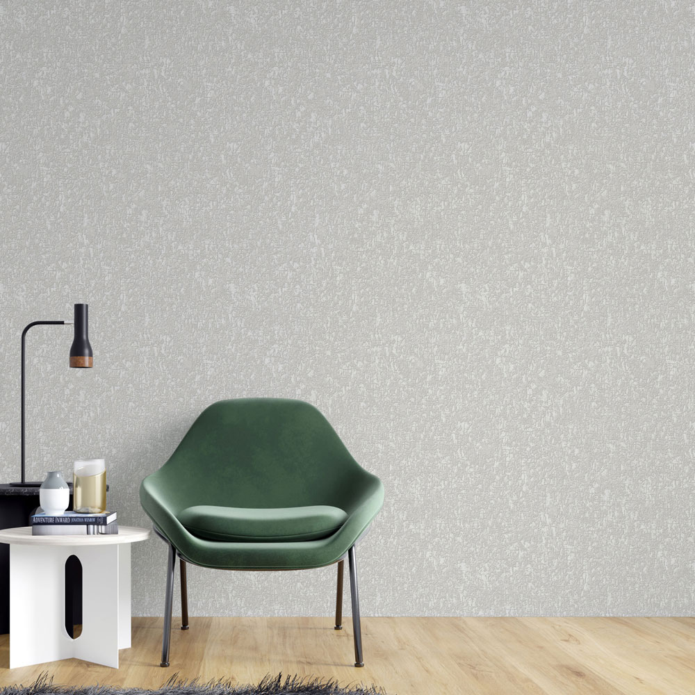 Luxuriöse graue Vliestapete, Stuckmuster mit kleinem Silberglitzer.