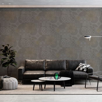 Luxuriöse halbglänzende braungraue Vliestapete, Stickerei- und Spitzenimitation, stellenweise mit kleinem Goldglitzer.