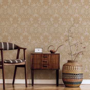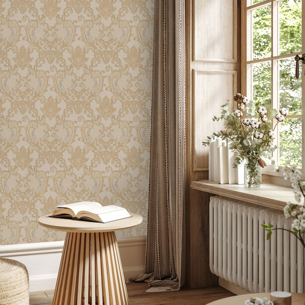 Luxuriöse hellbeige Vliestapete, Barockmuster mit goldbeigem Halbglanz, kleinem Goldglitzer.
