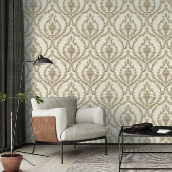 Luxuriöse hellbeige Vliestapete, braunes Barockmuster mit kleinem Goldglitzer.