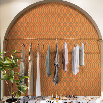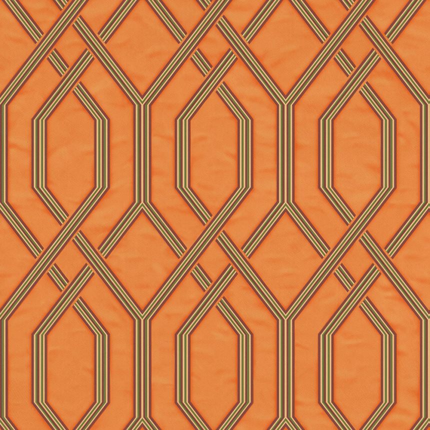 Luxuriöse halbglänzende Vliestapete mit Vinyloberfläche, orangefarbenem Hintergrund und geprägten Konturen in Burgunder-, Grün- und Goldmetallic.
