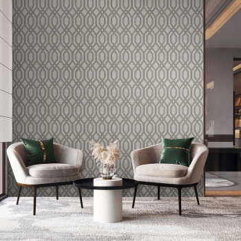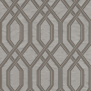 Luxuriöse halbglänzende Vliestapete mit Vinyloberfläche, grau-silberner Hintergrund, geprägte Konturen in Silber, Schwarz und Braun.