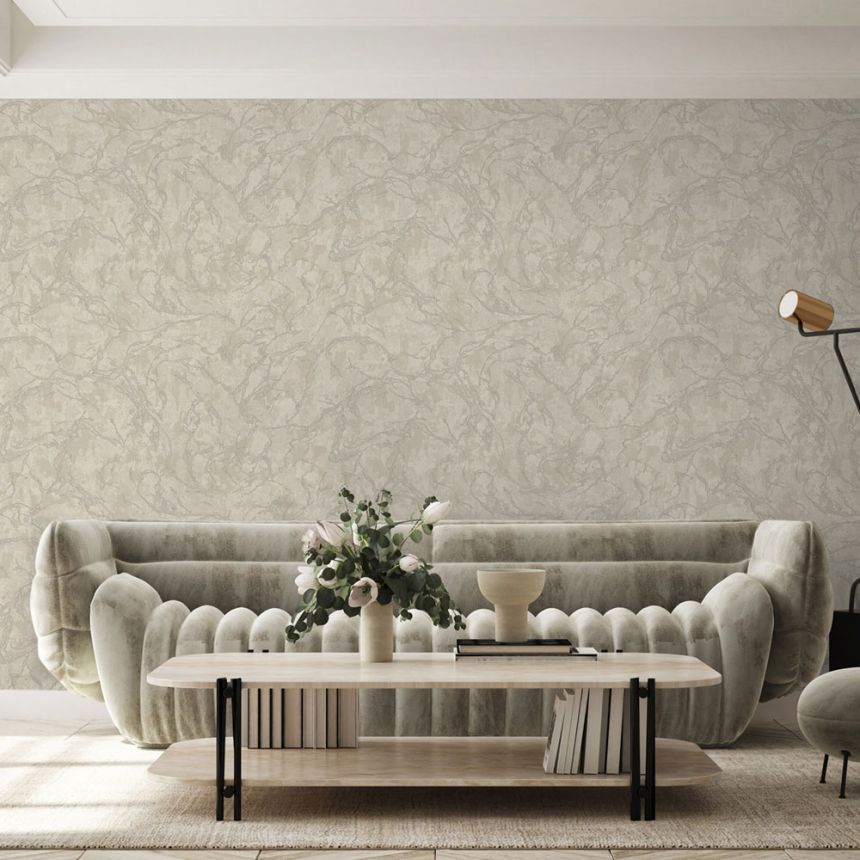 Luxuriöse Vliestapete mit Vinyloberfläche, hellbeiger Hintergrund mit metallischem Halbglanz, metallischer Marmorierung.