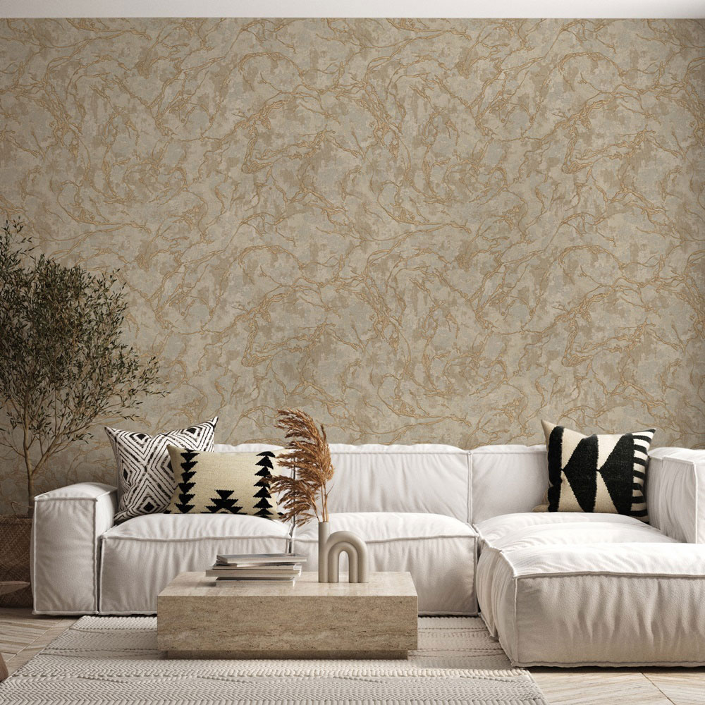 Luxuriöse Vliestapete mit Vinyloberfläche, braun-beiger Hintergrund mit metallischem Halbglanz, Marmorierung mit Gold- und Silberglanz.