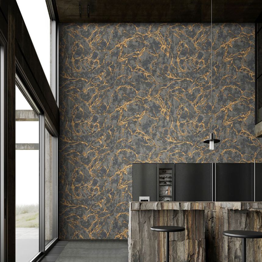 Luxuriöse Vliestapete mit Vinyloberfläche, schwarz-silberner Hintergrund, goldene Marmorierung.