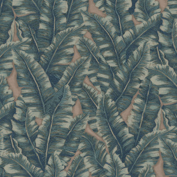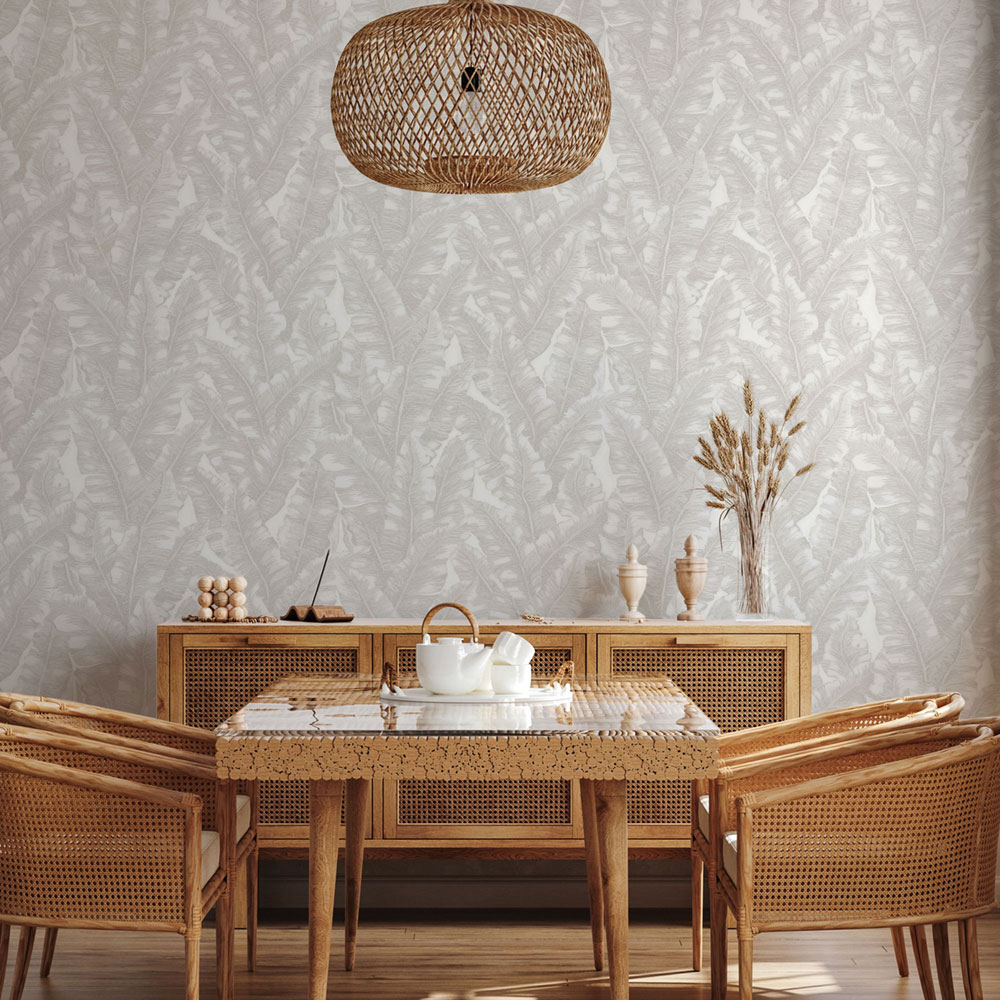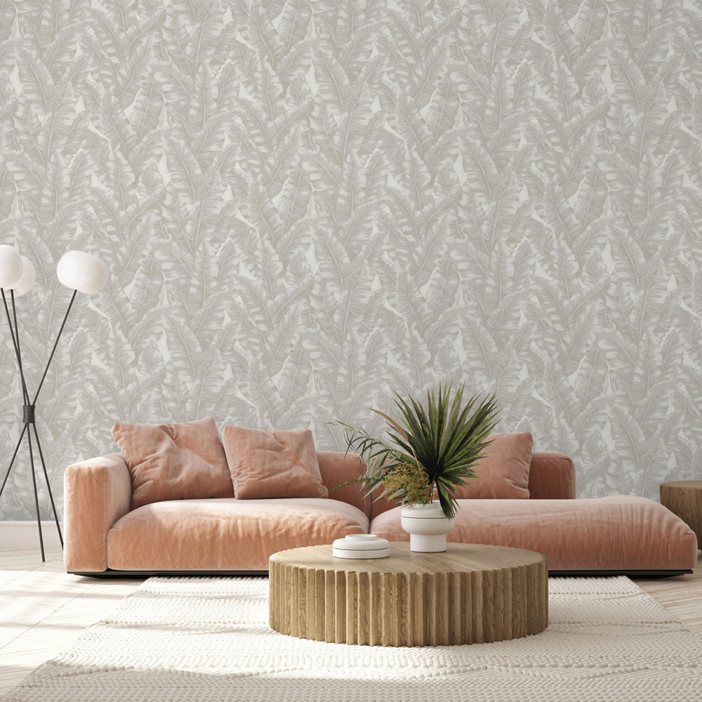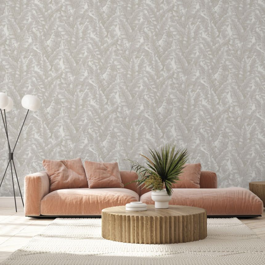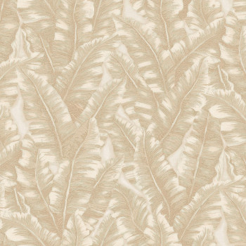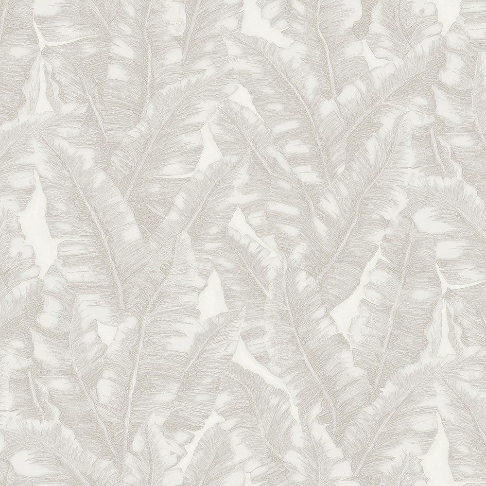 Luxuriöse Vliestapete mit Vinyloberfläche, Bananenblatt-Motive in halbglänzenden Cremetönen.