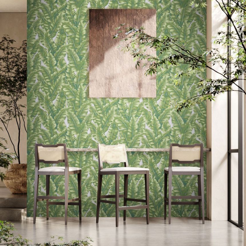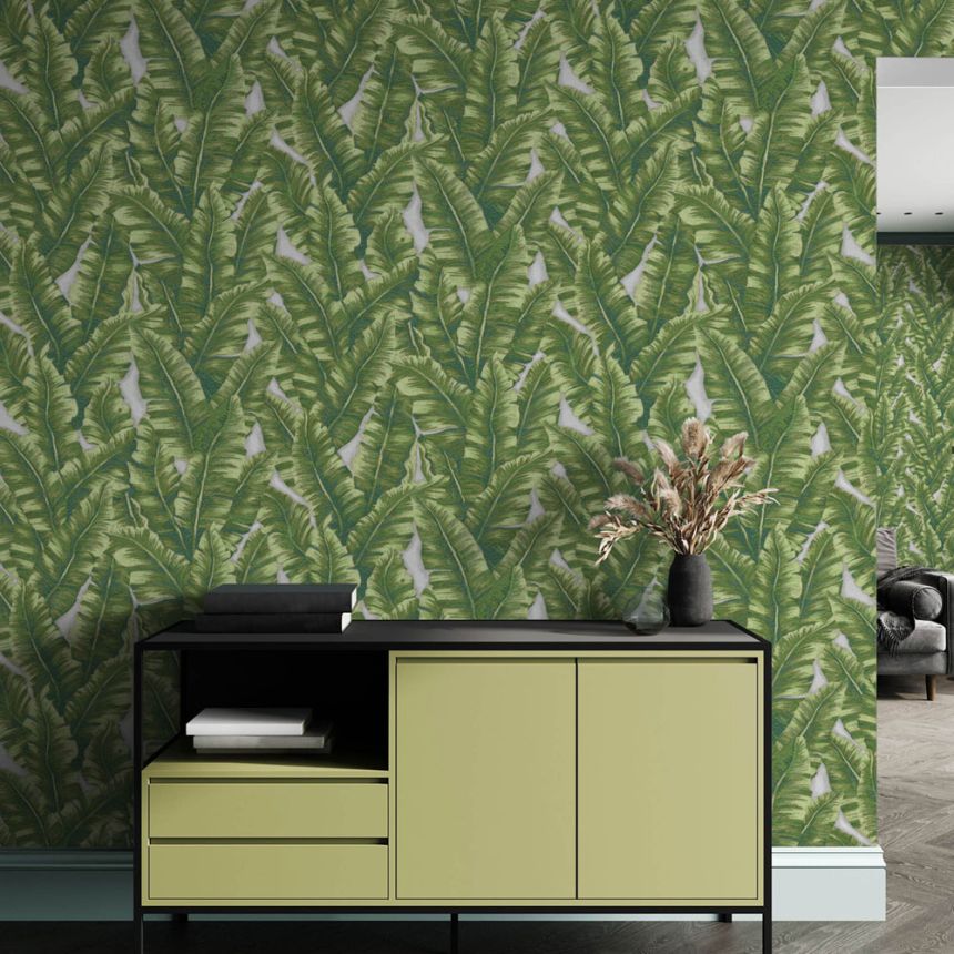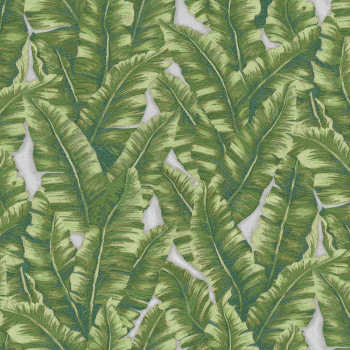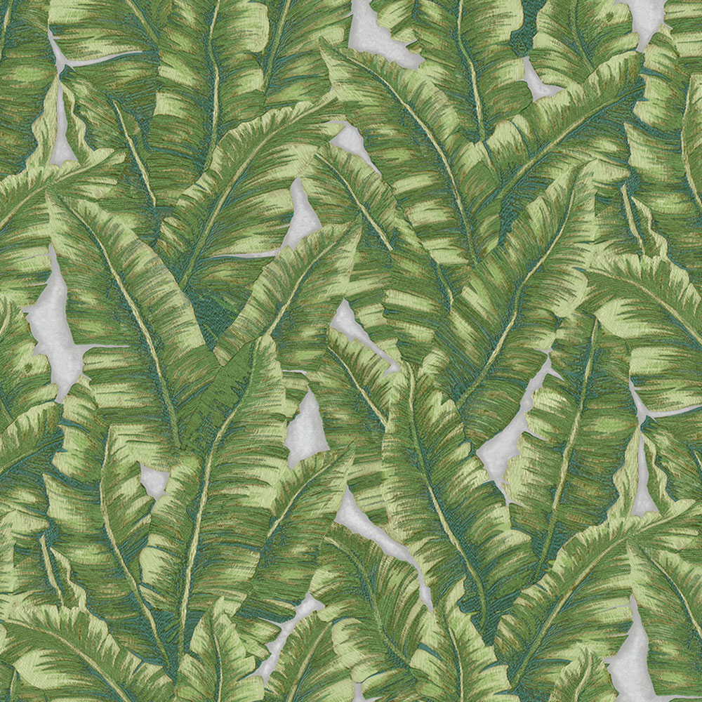 Luxuriöse Vliestapete mit Vinyloberfläche, Bananenblatt-Motive in Grüntönen, grauer Hintergrund.
