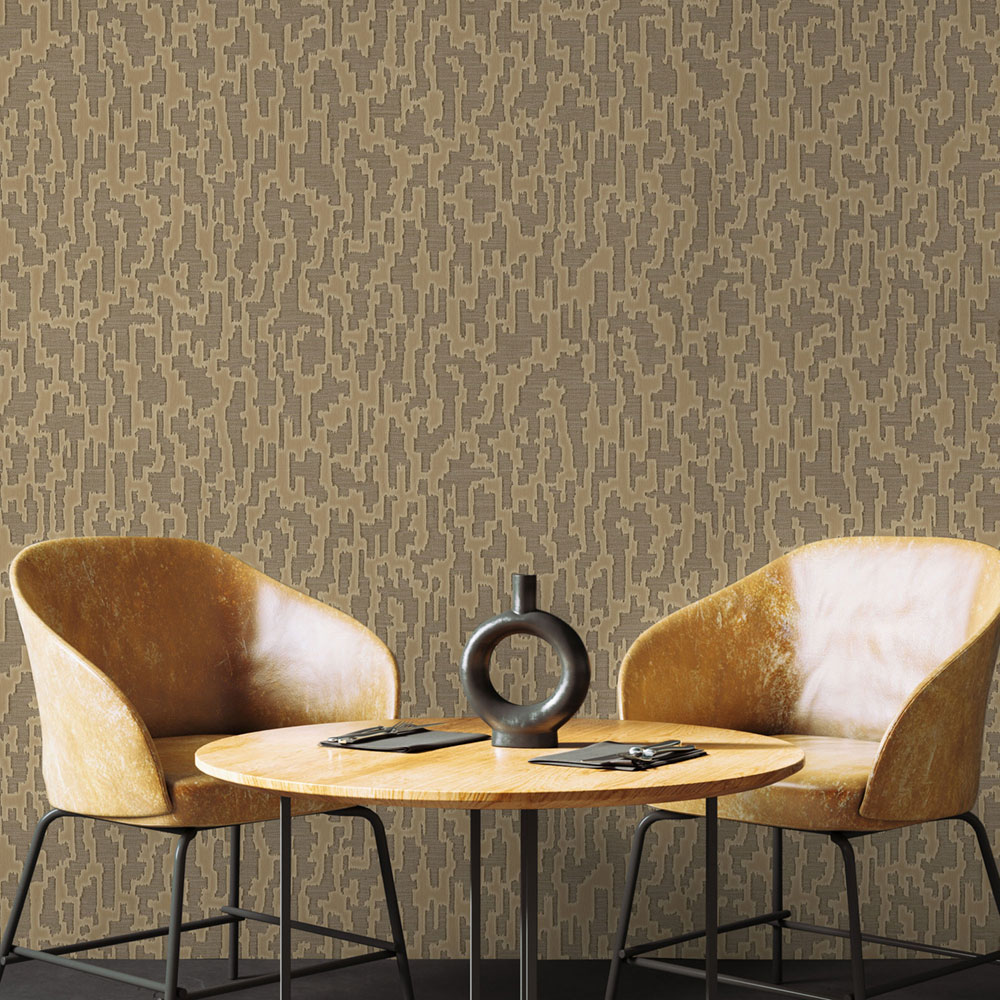 Vliestapete mit Vinyloberfläche, Stoffimitat in Braun- und Goldtönen.