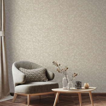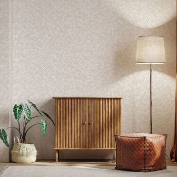 Vliestapete mit Vinyloberfläche, Bastmatten-Imitation, in halbglänzenden Creme- und Hellbeigetönen.