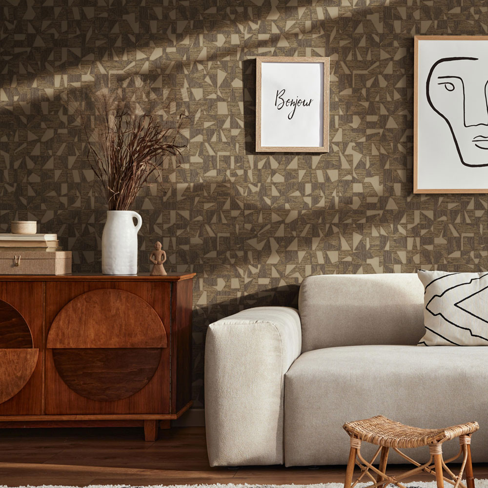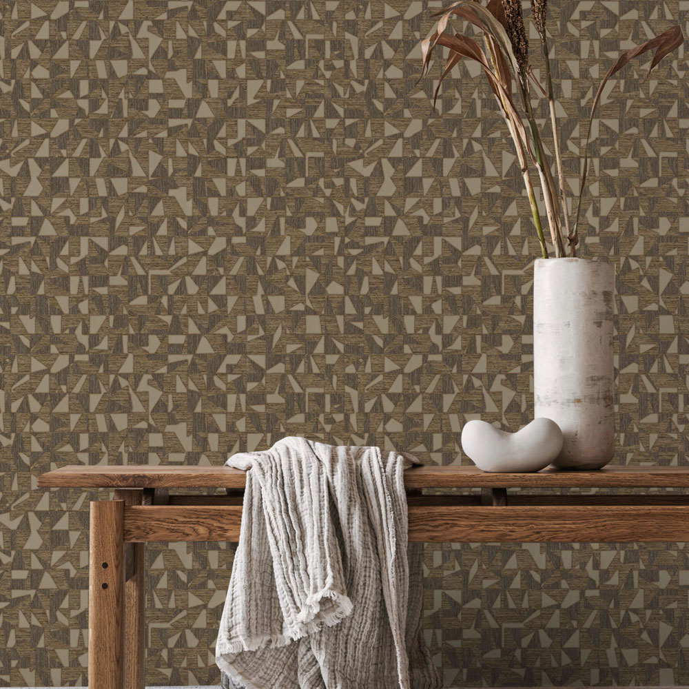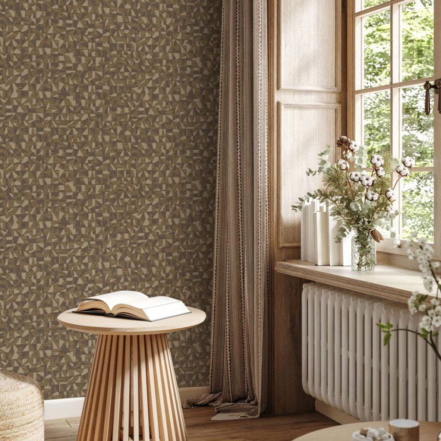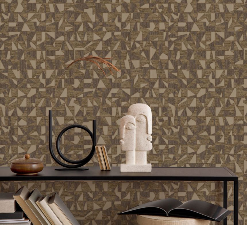 Geometrische Vliestapete mit Vinyloberfläche, effektvoller Strukturwechsel, Braun- und Goldtöne.