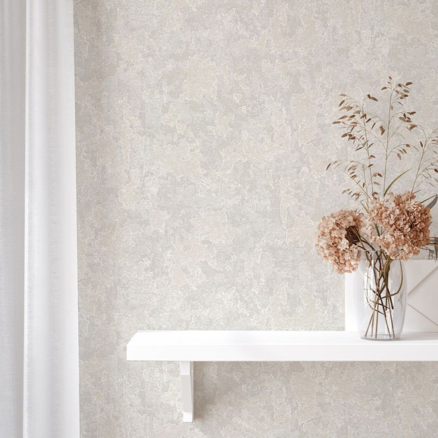 Luxuriöse Vliestapete mit Vinyloberfläche, Design erinnert an historische Putze, Stuck, cremefarben halbglänzend.