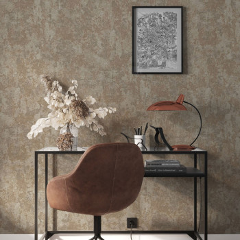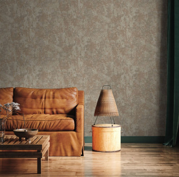 Luxuriöse Vliestapete mit Vinyloberfläche, Design erinnert an historische Putze, Stuck, Braun- und Goldtöne.