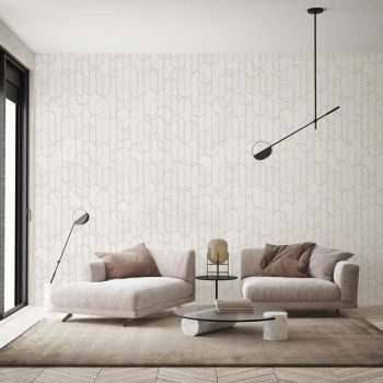 Geometrische Vliestapete mit Vinyloberfläche, effektvoller Strukturwechsel, Creme- und Graucremetöne, glatte silberne Konturen.