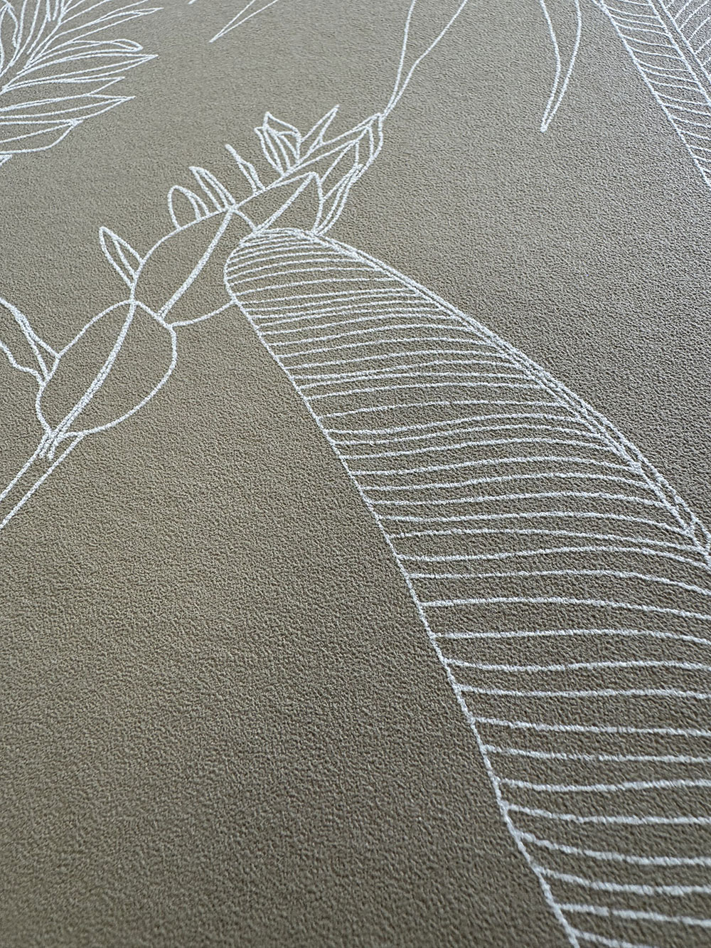 Beigefarbene Vliestapete, Umrisse von tropischen Blättern.