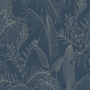 Blaue Vliestapete, graue Umrisse tropischer Blätter.