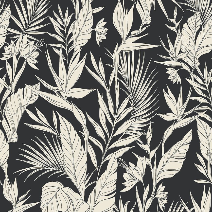 Matte schwarze Vliestapete, geprägte glänzende cremefarbene Blätter.