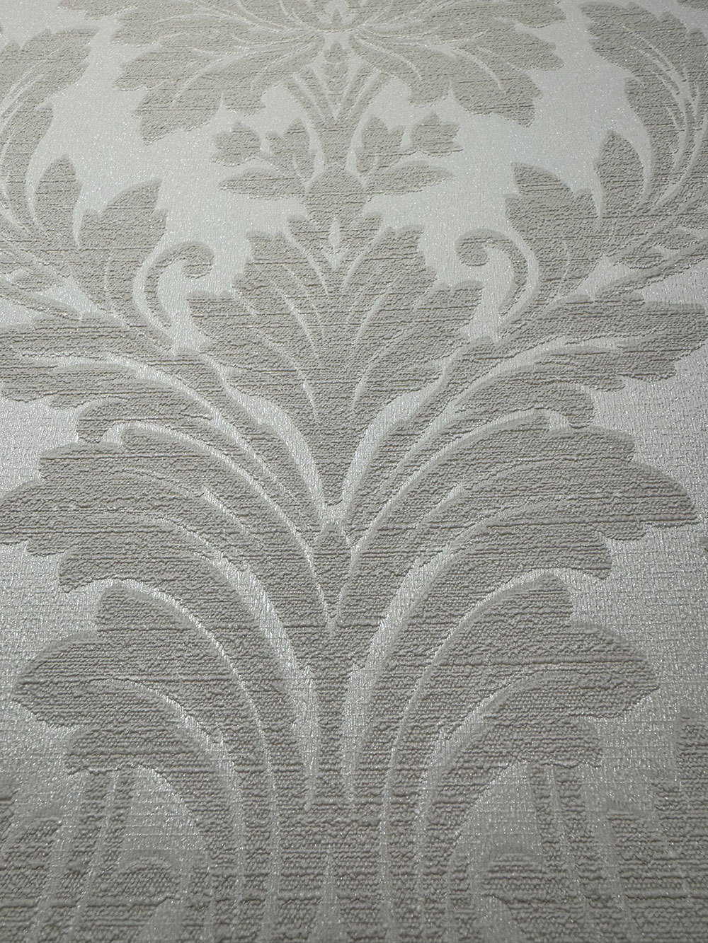 Weiß-cremefarbene Vliestapete mit barockem Damastmuster, Stoffstruktur.