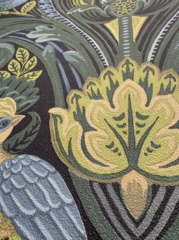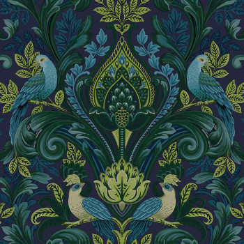 Original Vliestapete - ornamentale Naturmuster und Vögel; Grün-, Blau- und Schwarztöne, sandige Textur.