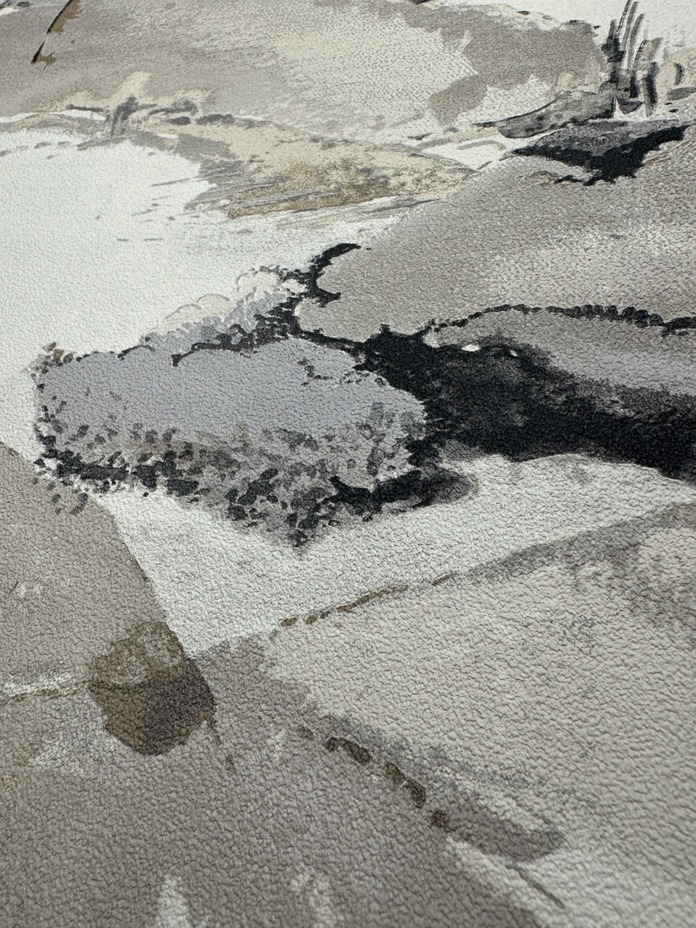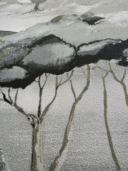 Grau-beige Vliestapete, Landschaftsmotiv mit Bäumen; feine Sandstruktur.