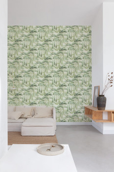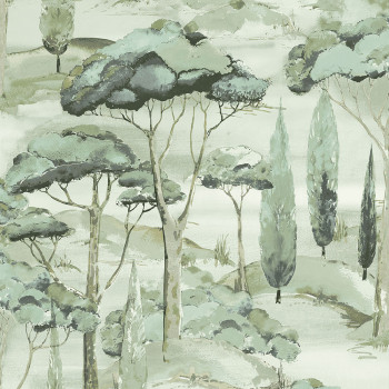 Grüne Vliestapete, Landschaftsmotiv mit Bäumen; feine Sandstruktur.