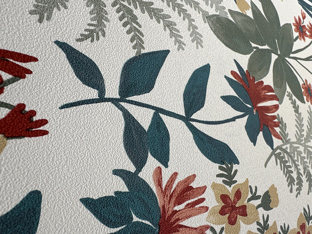 Vliestapete, Blumenmotive in den Farbtönen Grün, Türkis, Ziegelrot und Beige. Feine Sandstruktur.