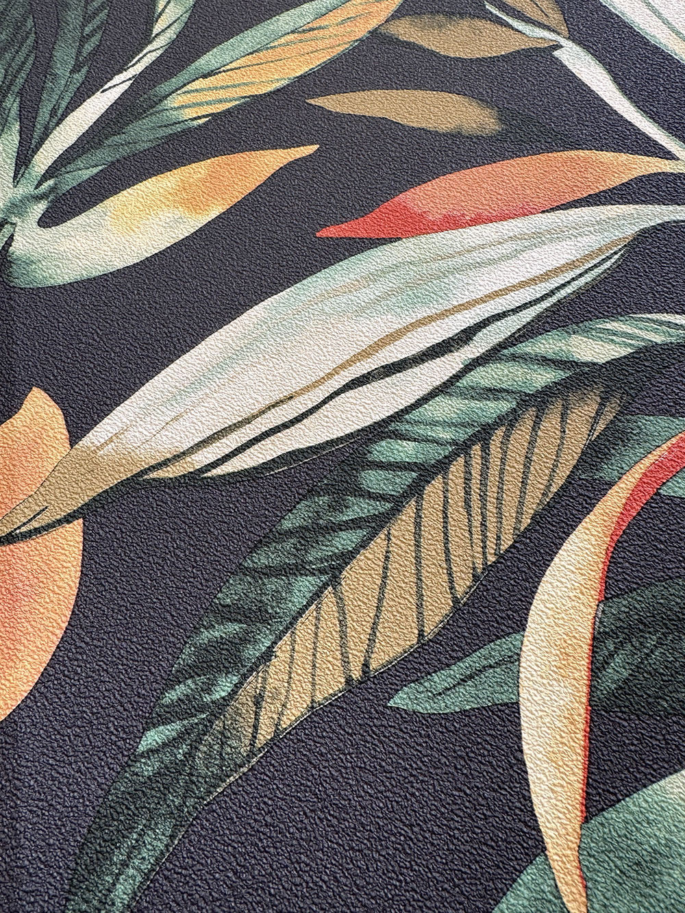 Schwarze Vliestapete, Blättermotive in Grün-, Braun- und Orangetönen.