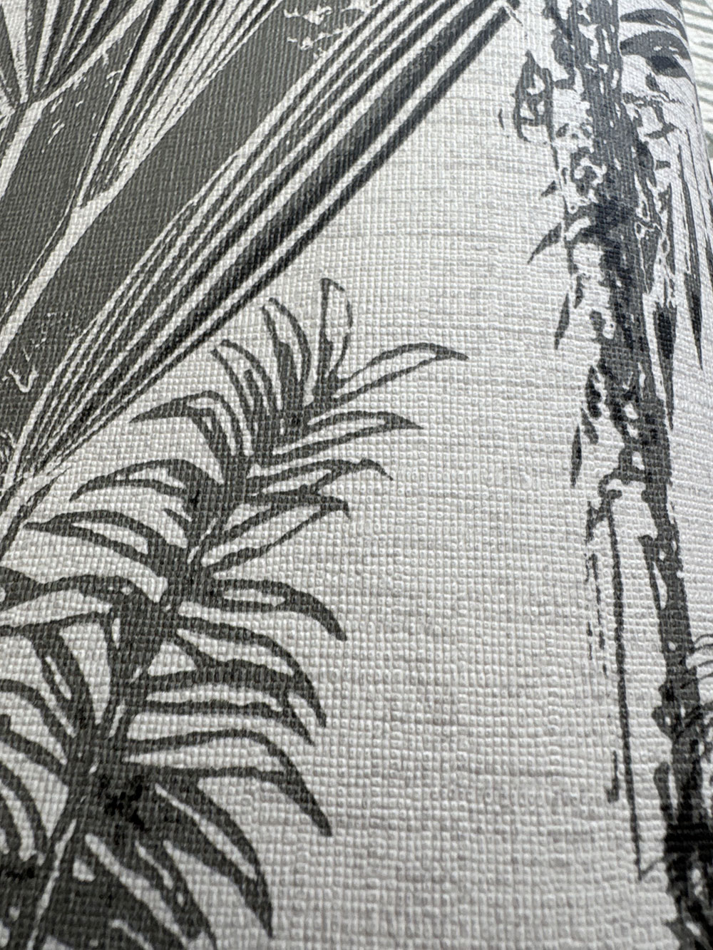Vliestapete, Motive aus Blättern und Palmen in Grau- und Schwarztönen.