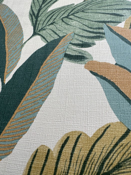 Weiße Vliestapete, Blättermotive in Ocker-, Grün-, Türkis- und Braunrottönen.