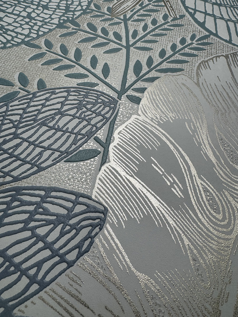 Geprägte Vliestapete, grauer Hintergrund, blaue, grüne und metallische Blätter.