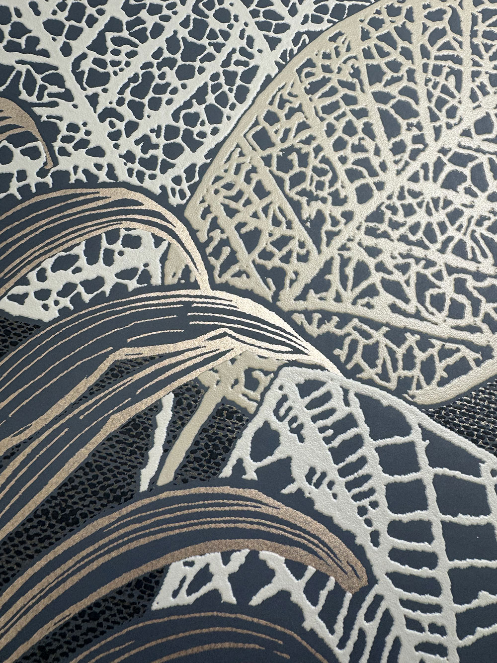 Geprägte Vliestapete, schwarzer und goldener Hintergrund, beige und goldene Blätter.