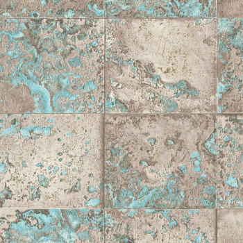 Strapazierfähige, abwaschbare Vinyltapete in Braun- und Türkistönen mit goldbeigen Reflexen.