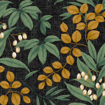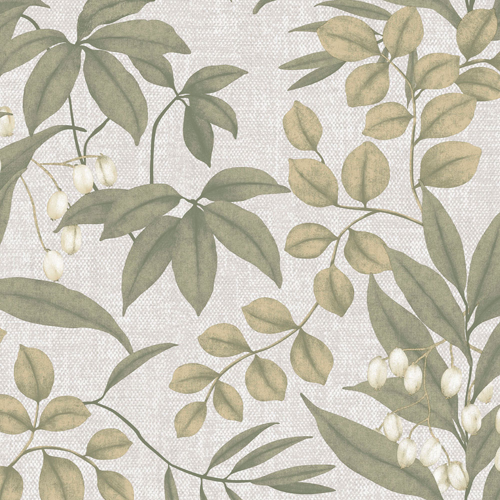 Creme/naturfarbene Vliestapete, Zweige und Blätter in Grün- und Ockertönen,, die Optik eines gröberen Stoffes.