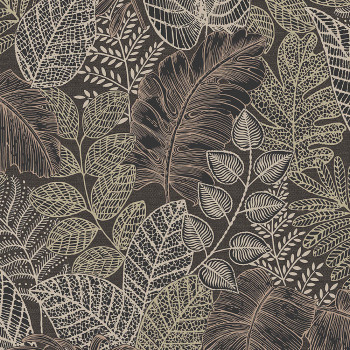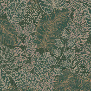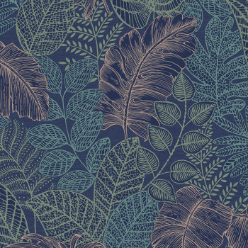 Geprägte Vliestapete, blauer Hintergrund, grüne, türkise und roségoldene Blätter.