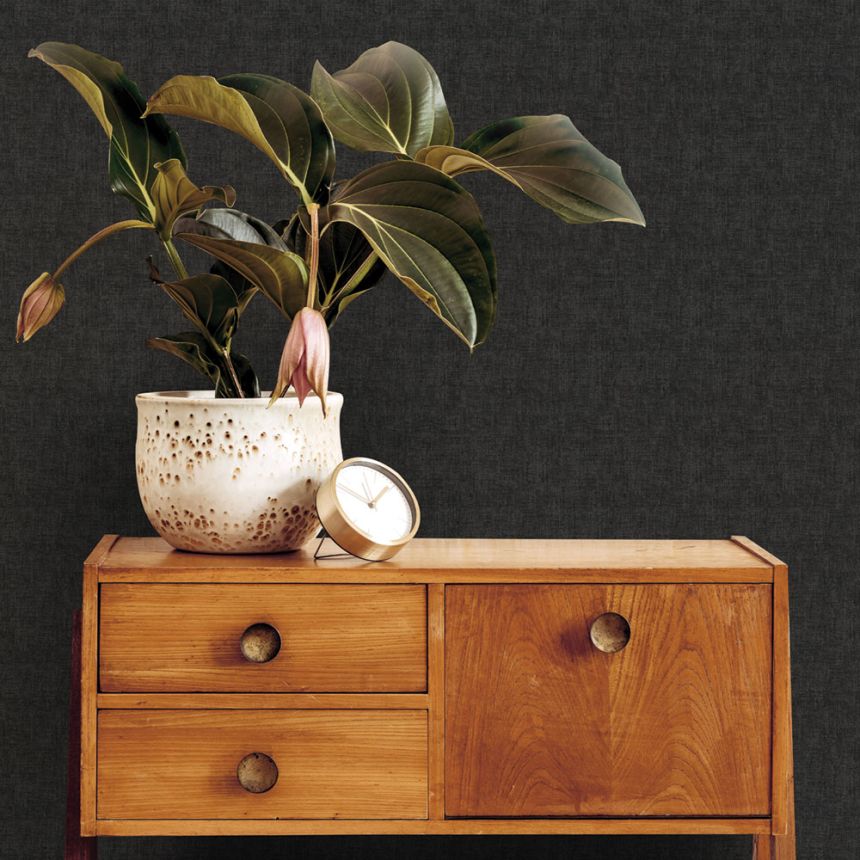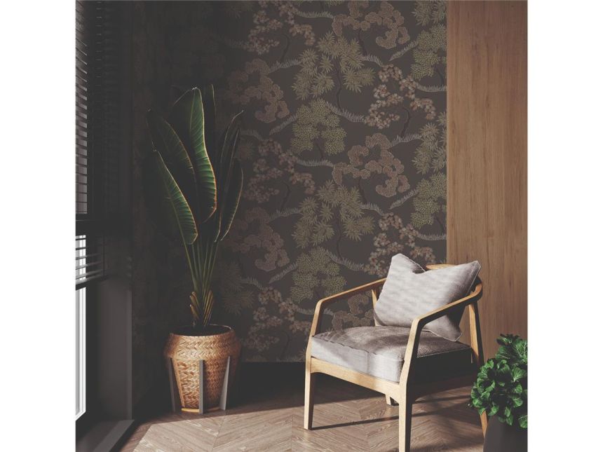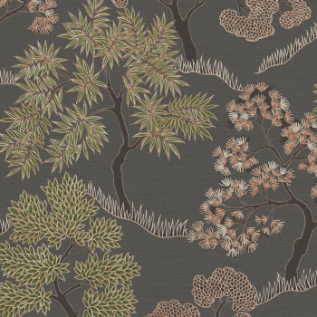 Dunkelgraue Vliestapete, Bäume mit goldenen Konturen, Stoffstruktur.