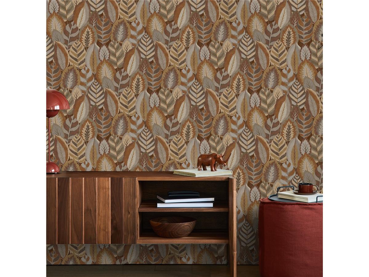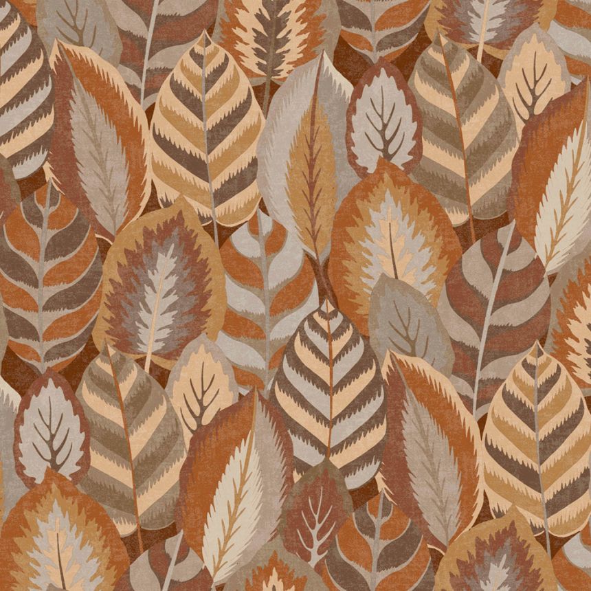 Vliestapete, Blättermotive, Braun- und Grautöne, Stoffstruktur.