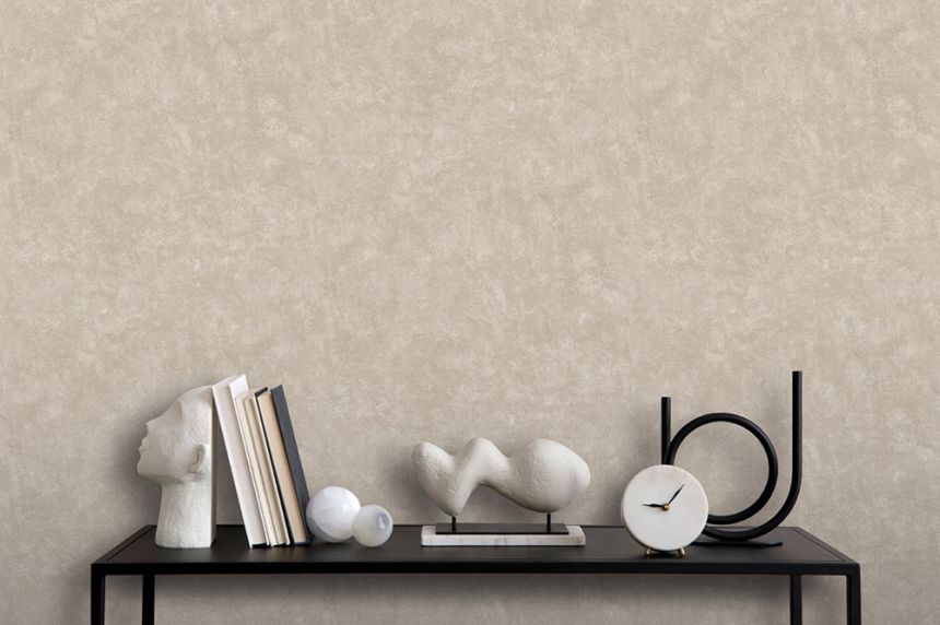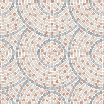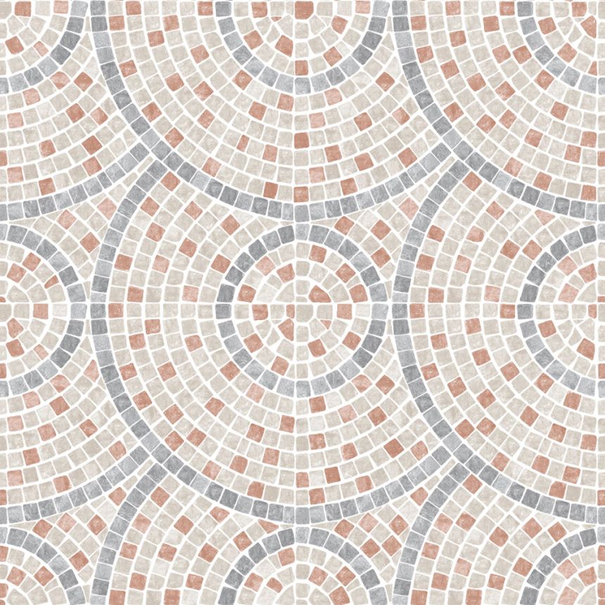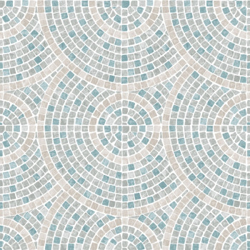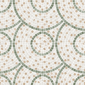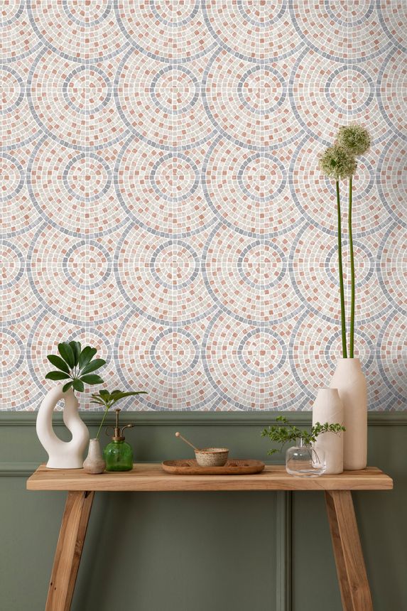 Vliestapete mit Vinyloberfläche, Mosaikmuster in Grau-, Beige- und Brauntönen, feine Struktur.