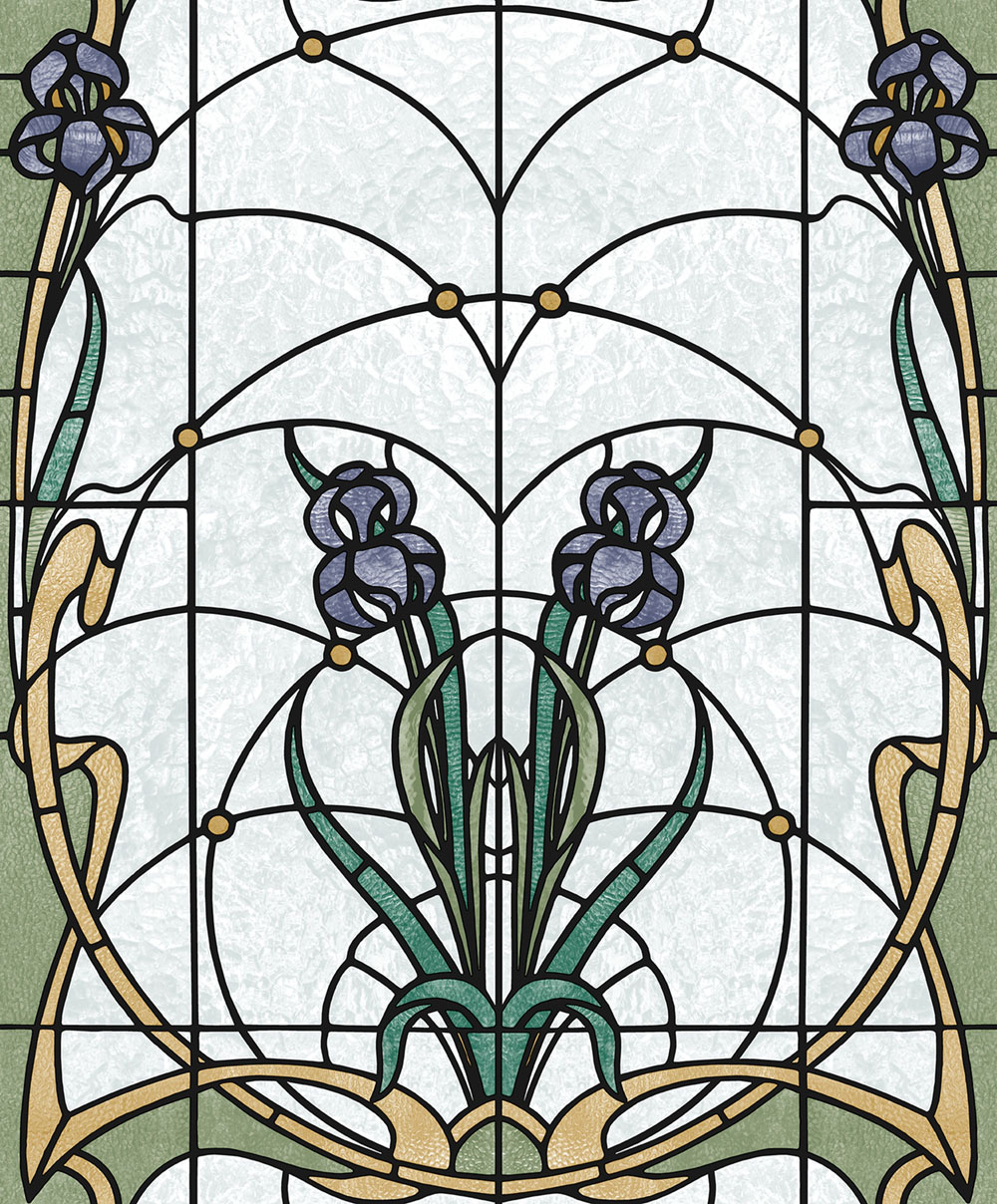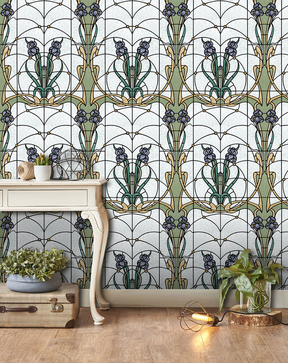 Grauweiße Vliestapete mit Vinyloberfläche, florales Buntglas-Design in Blau-, Grün- und Beigetönen.