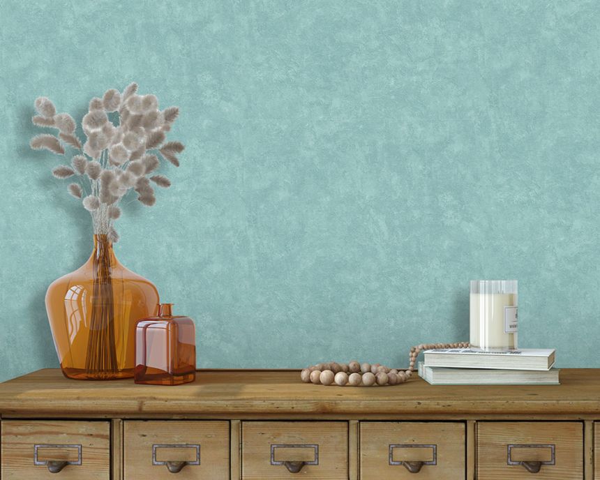 Türkisfarbene Vliestapete in Beton-Imitation.