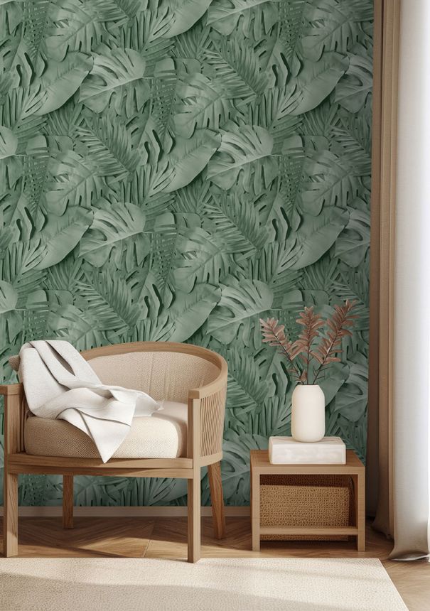Vliestapete in Betonoptik, Farbtönen von Flaschengrün.