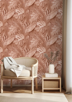 Vliestapete, tropische Blätter in den Farbtönen Altrosa und Ziegelrot.