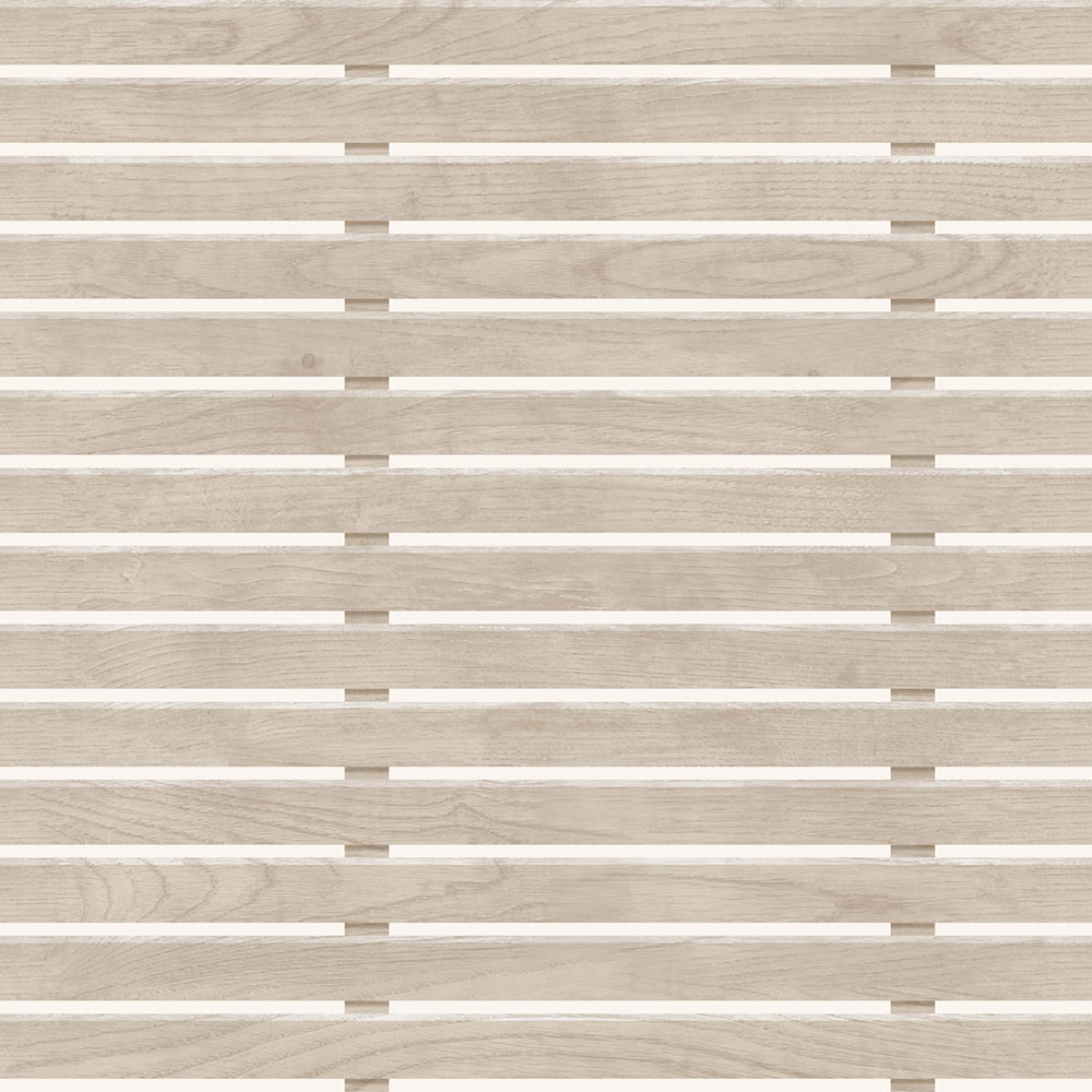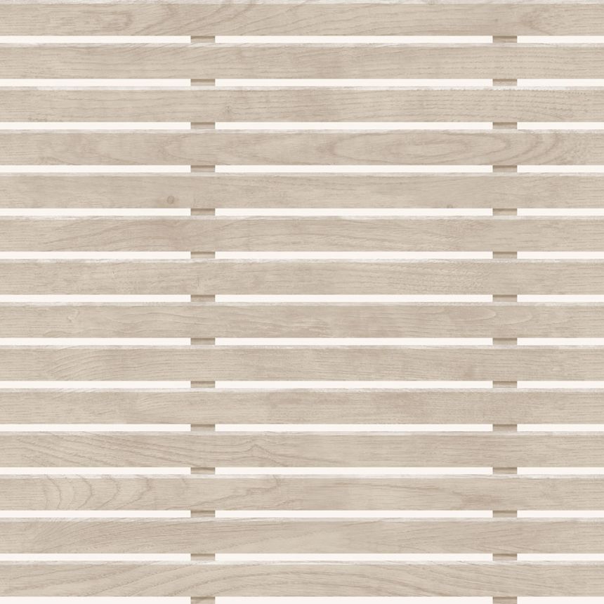 Vliestapete, 3D Holzpaneel-Design, Lamellen in natürlichem Holzton, Zwischenräume zwischen den Lamellen in seidenmatt weiß.
