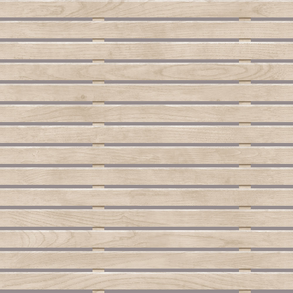 Vliestapete, 3D Holzpaneel-Design, Lamellen in natürlichem Holzton, silberne Zwischenräume zwischen den Lamellen.