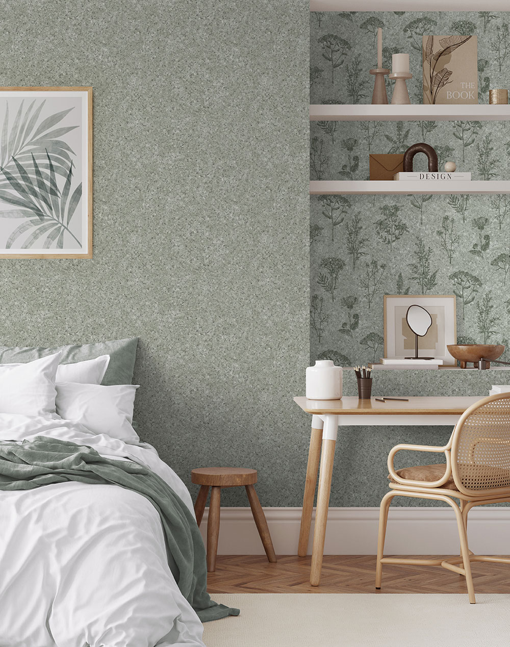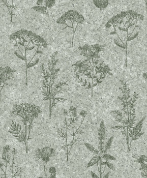 Vliestapete, Korkimitation mit Mustern aus Wiesengräsern und Blumen in Grüntönen.